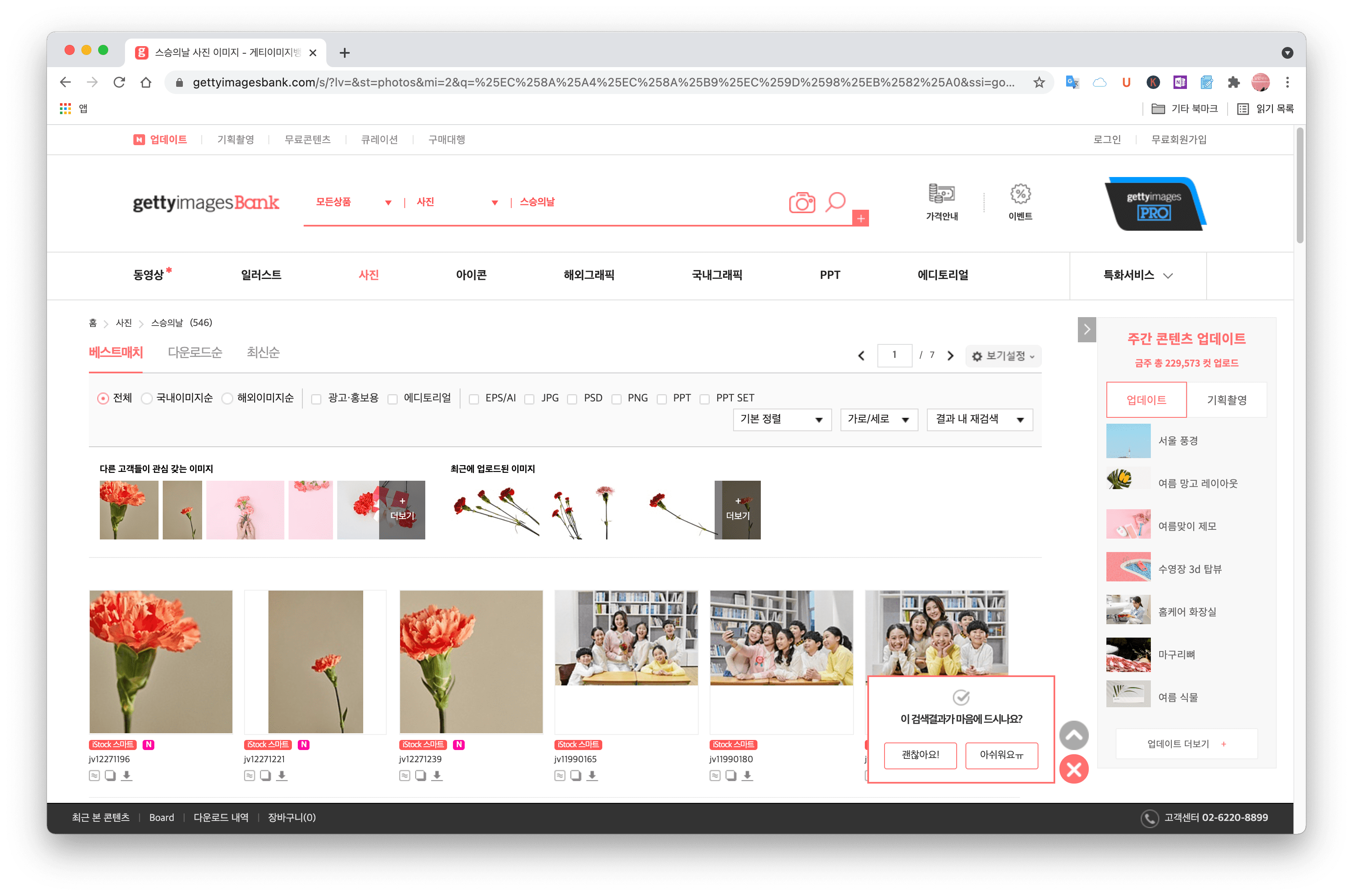 크라우드픽 사이트는 유료로 이미지를 다운로드할 수 있습니다. 장당 500~1000원에 구매할 수 있으면 유료로 제공되는 것만큼 다양하게 사진을 선택할 수 있습니다. 국내 사이트라 한국 감성에 맞는 사진을 찾는데 도움이 됩니다. '스승의 날'로 검색해보니 카네이션을 비롯해서 아주 많은 양의 관련된 사진을 찾을 수 있었습니다.