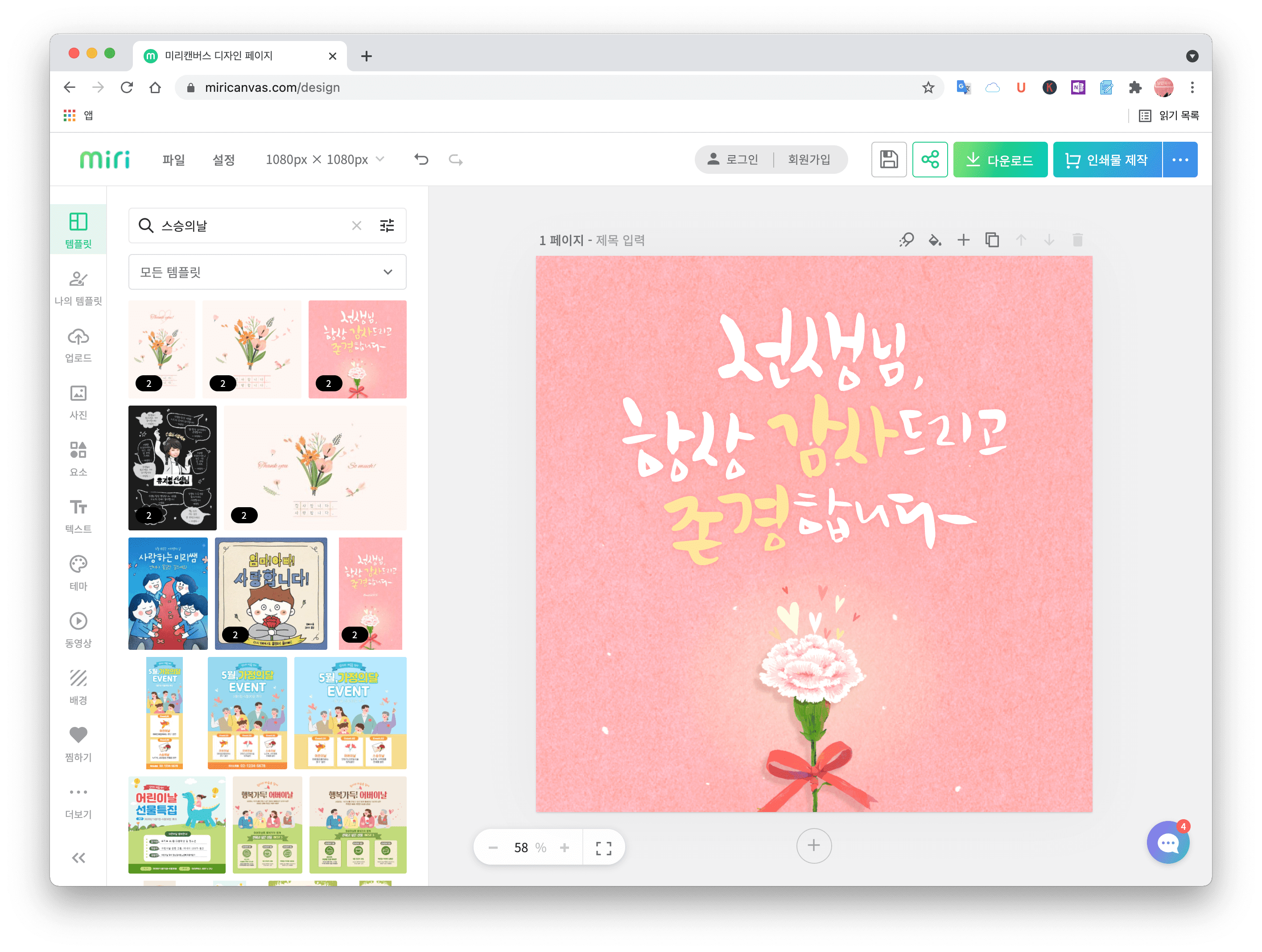 '스승의 날'이라고 검색하면 무료 카드 도안과 이미지 리스트가 나옵니다. 텍스트를 조금 변경하고 사진이나 이모티콘을 넣어서 수정한 다음 JPG, PNG 또는 mp4로 다운로드가 가능합니다.